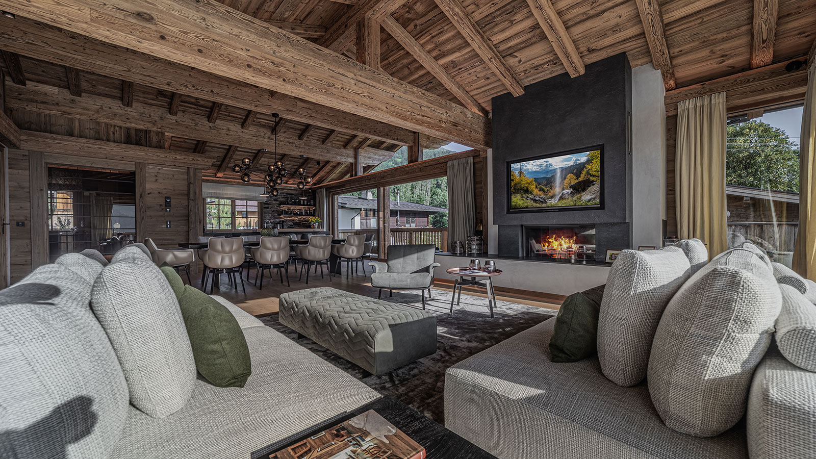 Set on a tranquil 587m² plot, the chalet features a south-west-facing facade and peaceful, private surroundings.