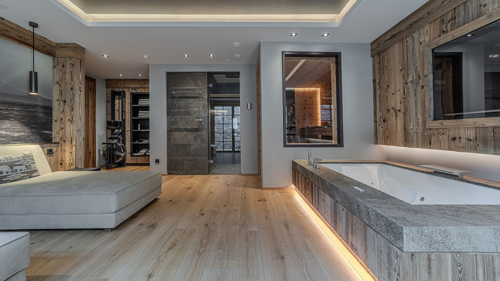The property also features a wellness area with a sauna and gym, as well as five covered parking spaces outside.