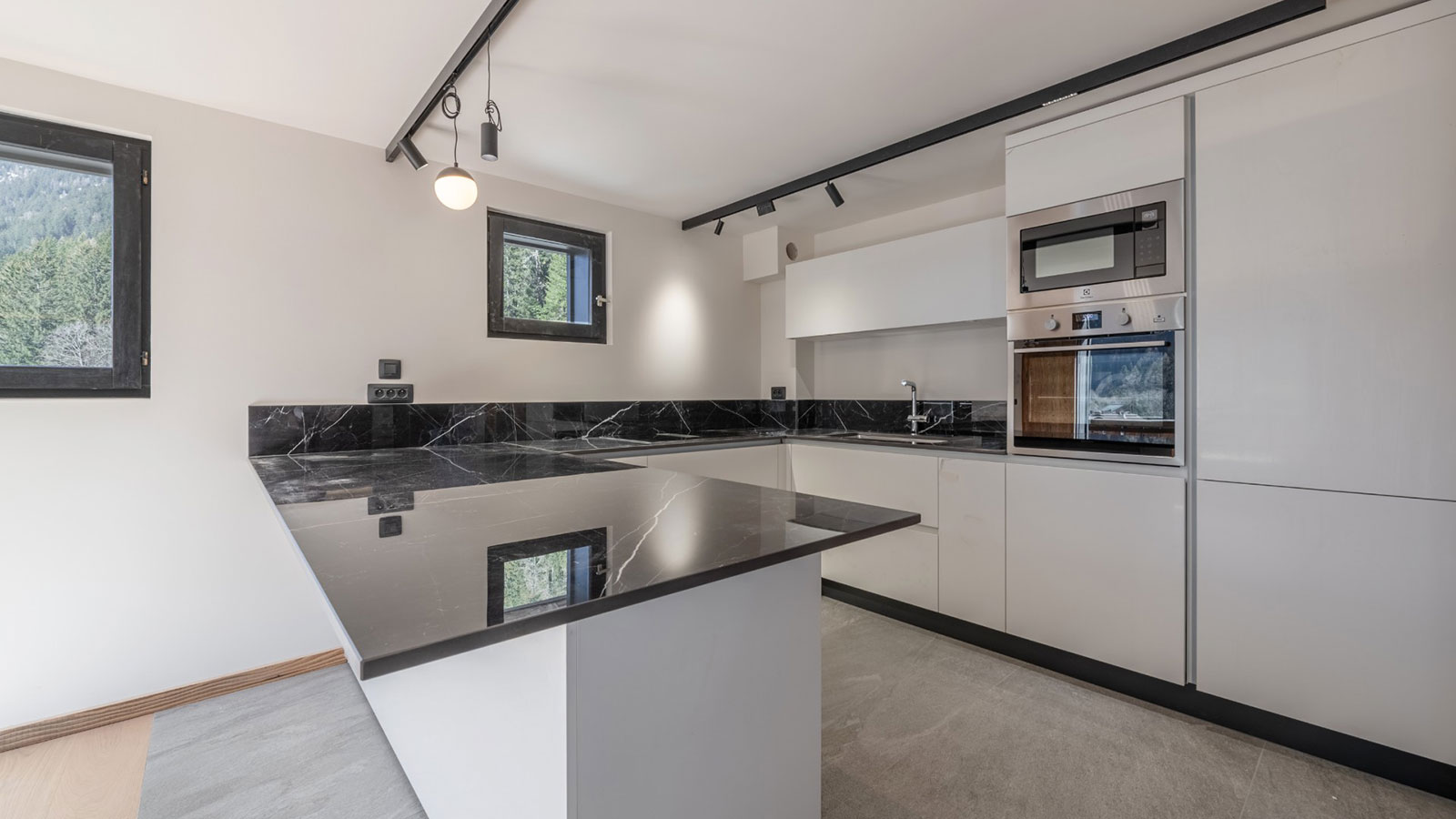 Boasting a spacious floor area of 86.4 m², the apartment features a fully equipped kitchen, two balconies with panoramic views, a ski room, and private parking.