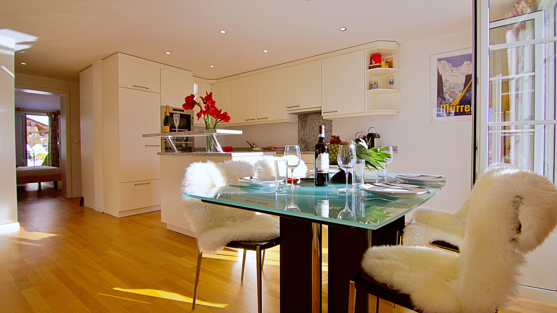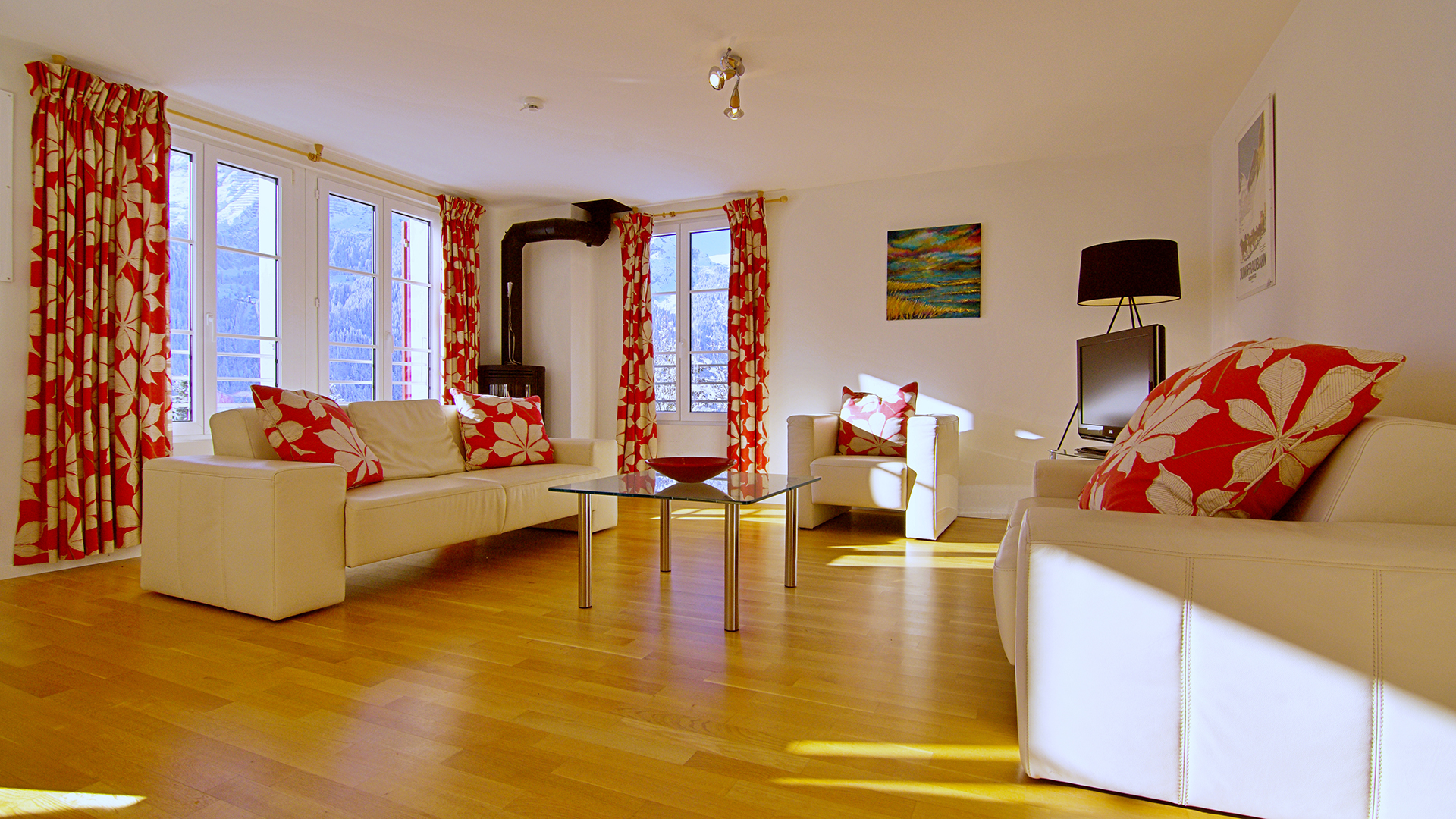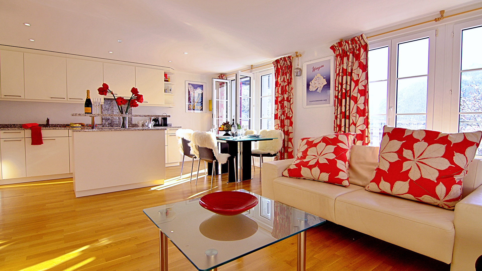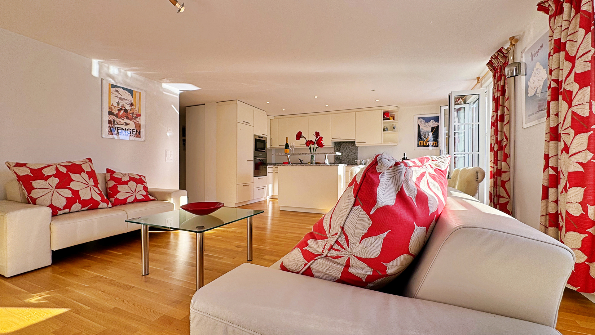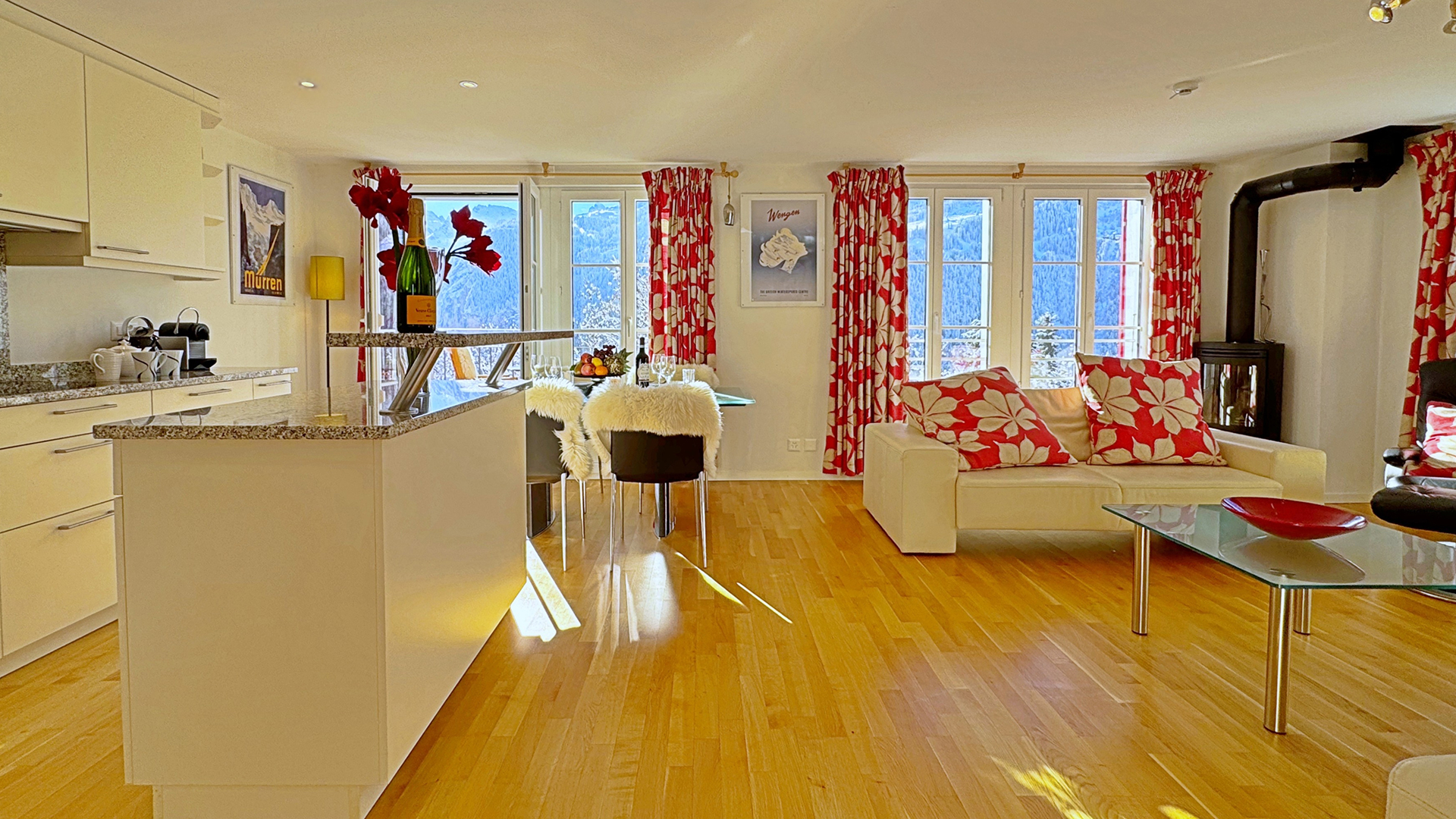 A bright, spacious and open apartment situated on the second floor of a beautiful, historic and entirely renovated building in Wengen.